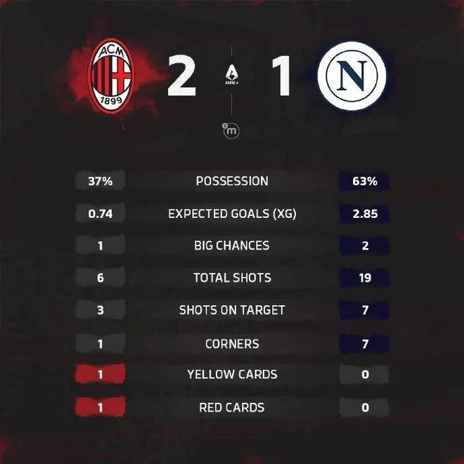 最终全场比赛结束,米兰2-1击败那不勒斯,登顶意甲积分榜!