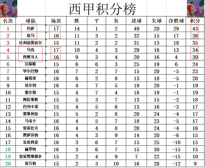 积分榜方面,巴萨主场拿下奥萨苏纳后豪夺联赛7连胜,先赛的他们已经将和皇马的差距拉大到7分。西班牙人近来的状态也很不错,俨然一匹大黑马,客场击败赫塔菲后取得一波4连胜,少赛一场只落后第4的马竞4分。